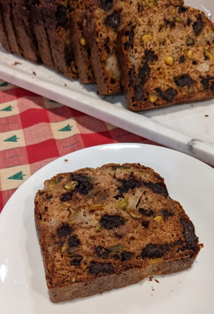 Pear, Pistachio, Chocolate Chunk Cake